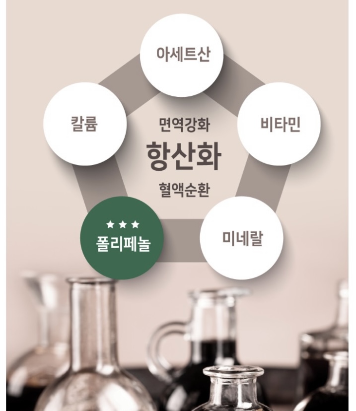 폴리페놀 성분을 많이 함유하고 있어 신진대사를 원활하게 하고 에너지를 충전시켜 주는 효과가 있으며 지방을 분해하고 체내에서 합성하는 것을 억제하여, 다이어트에 도움을 주고 복부비만의 주범인 중성지방이 몸에 쌓이는 것을 방지한다고 합니다.