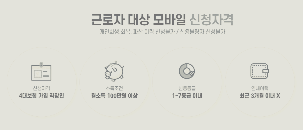 4대보험 가입된 근로자, 월 소득 100만원만이상 되어야 하며, 은행 방문 없이 최저금리를 무료로 비교하고 확정한도를 확인할 수 있다고 합니다. 단, 연체이력이 최근 3개월 이내 없어야 신용등급이 낮더라도 대출 진행이 가능하다고 합니다.